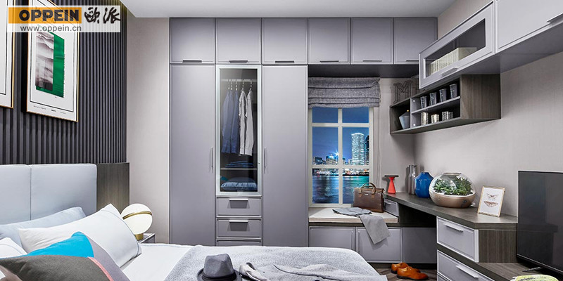 这款卧室衣柜选用视觉柔软的灰色漆面,掩盖整个窗户墙面,使其看起来十分特别,并供给一个令人愉快的靠窗座位。衣柜拼接飘窗柜规划,储物、休闲两不误。