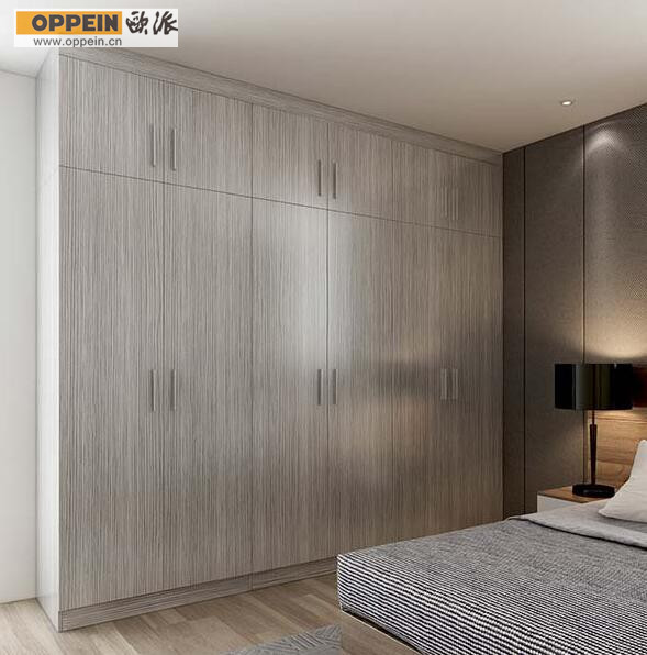 这款平开门衣柜选用刨花板制成,门饰面选用木纹燕尾边和天然饰面制成。不管是挂衣、折叠衣服,仍是凌乱的小物件,都能找到比较适宜的存储当地。整个衣柜规划简略大方,木质纹路更显质感。
