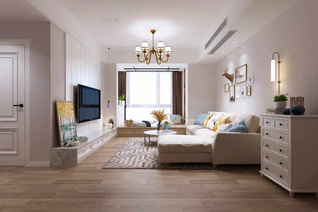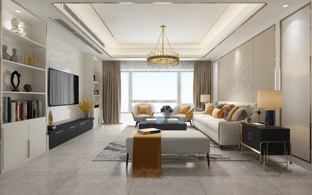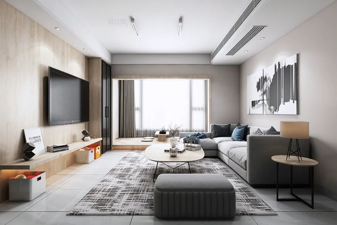 这个情况下的电视柜依然是买成品电视柜,不过是在装修之前就看好相应的款式(尺寸与颜色),然后在装修的时候预留出足够的尺寸,并在两侧装上与电视柜风格一致的定制柜,让空间风格统一,效果高级大气。
