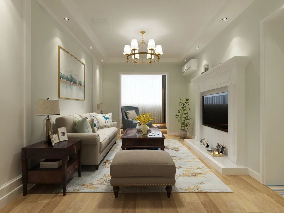在电视墙装一个壁炉造型,然后在壁炉下装一个大理石地台,地台上可以摆设装饰品与绿植,如此独特的设计,对现代美式风格,也是一种比较大胆的尝试。