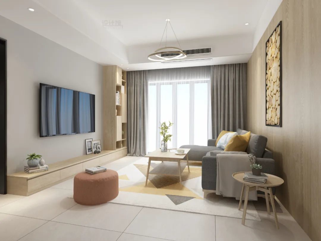 整个电视墙以木色的定制柜为基础,在底部加入木质感的地台,与整个电视墙保持统一的质感,带来一种自然简约的氛围气息。
